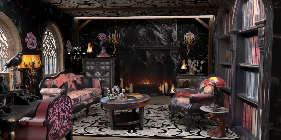 In an old castle, a formerly forgotten room has been transformed into a room honoring the poet Edgar Allen Poe…. Raven decor fills every dark nook and cranny. A vast library of olde, dusty books lines one wall…. Once upon a midnight dreary, while I pondered, weak and weary, Over many a quaint and curious volume of forgotten lore—