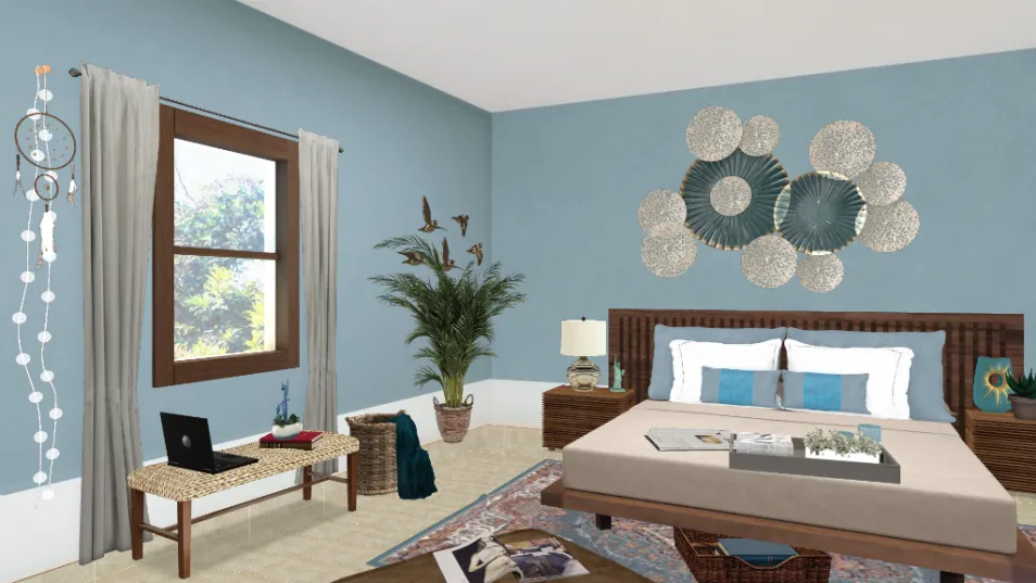 This request was made for the purpose of redesigning their bedroom. The only remains of the original design in this side of the room are where the window was roughly placed in addition to the tile floors. They emphasize on a modern, bohemian theme of blue which I hope I was able to bring! Feel free to give critique!