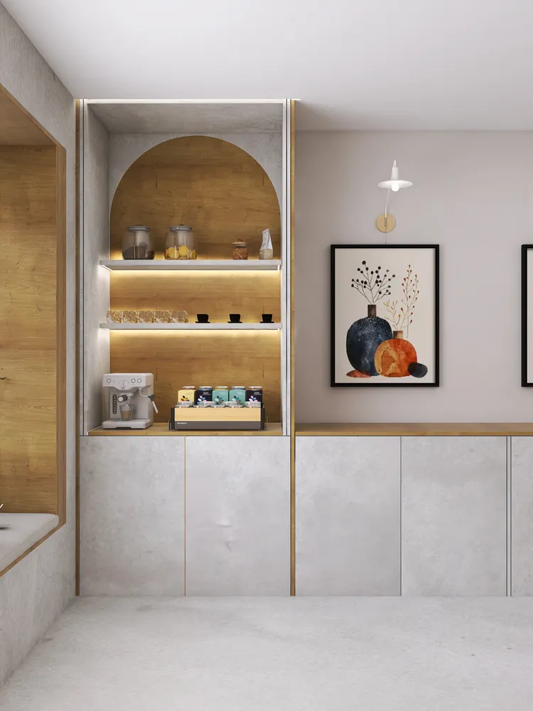 A coffee corner in the middle of a living room? It's a sure deal and if using pocket doors to hide it when not using, it's a tasty surprise to find it.