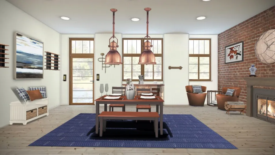 Rustic dining room with modern touches and brilliant red and deep blue finishes.