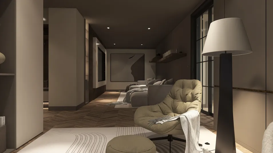This apartment is located in a vibrant Asian capital and features a modern, practical design with Western influences. Despite its small size, the space is thoughtfully arranged to maximize functionality. The color palette consists of soothing beige tones, creating a warm and inviting atmosphere.The open-concept kitchen seamlessly connects to a spacious living area, which includes a large television lounge. This layout encourages social interaction and makes the most of the available space. The design incorporates contemporary furnishings and smart storage solutions, ensuring that the apartment remains both stylish and efficient.