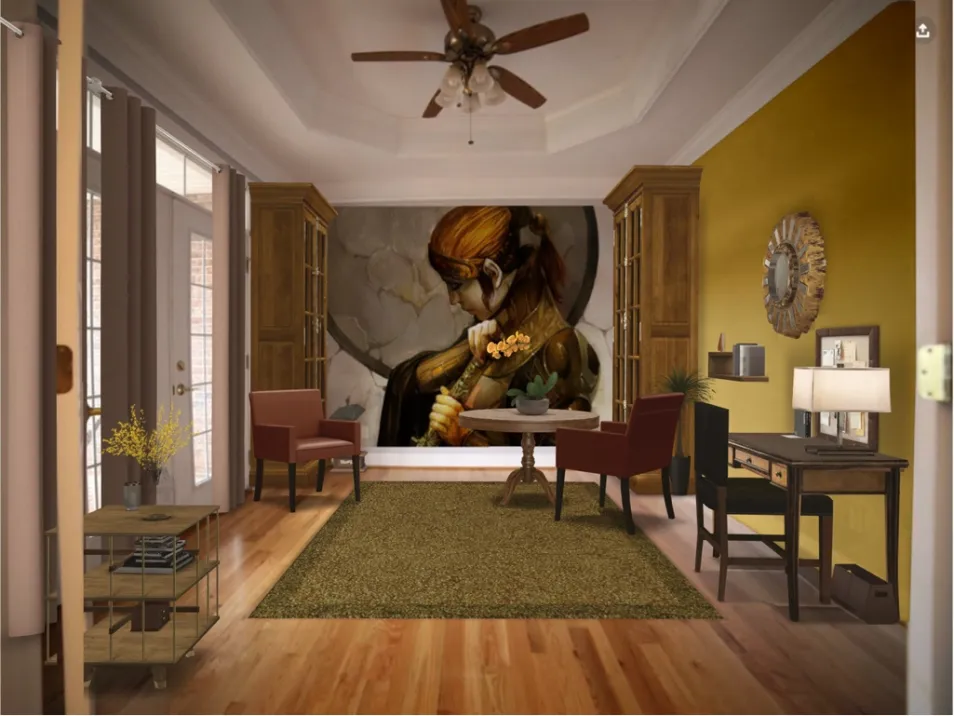 Masculine office space-library in dark ochre and earthy tones to compliment this female sword master