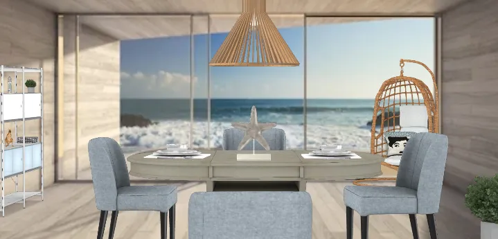 This is a beautiful room with blue and grayish beige accents and a large wicker cone chandelier. The decorating is nothing compared to the gorgeous view of the rocks, sand and ocean.
