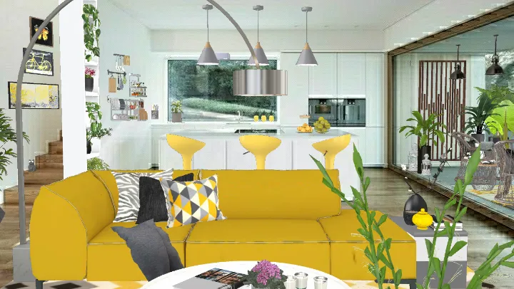 A bright and modern home with an open layout, including the outdoor area in the kitchen and living space, done in crisp white and sunny yellow, offset by charcoal, and brimming with greenery.
