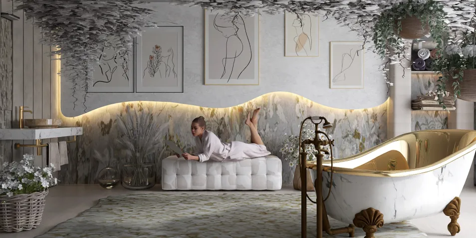 In this tranquil space, the walls whisper secrets of nature, while the golden accents glimmer like fleeting dreams. A plush chaise invites repose, echoing the soft sighs of the living art that adorns the walls. Here, luxury dances with simplicity, and time seems to pause.