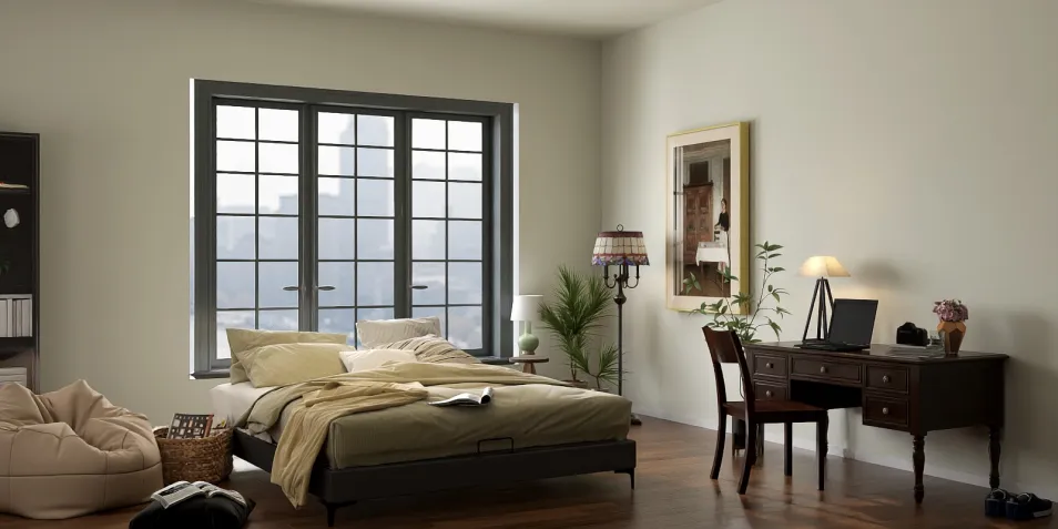 In the quiet embrace of morning light, the room whispers of simplicity. A bed, unmade yet inviting, sits beside a sturdy desk, hinting at unfinished stories. Outside, the city hums, while indoors, a stillness reigns, offering solace amid the chaos.