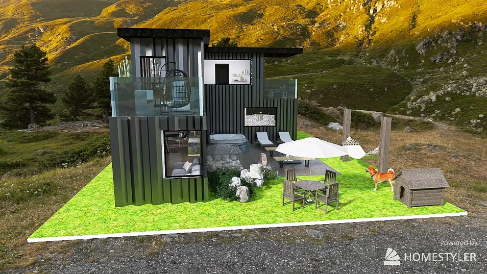 This Modern themed L-shaped home has a sleek black exterior and a grey toned interior with pops of blue and green throughout the house, there is a cozy breakfast nook and an island you can enjoy your meals at, along with a fire place inside or a fire pit outside you can get warm by, open concept throughout the house, large windows and beautiful balconies to overlook the mountain view making this narrow home feel much more roomy. This Luxury Shipping Container Home includes: -1 1/2 Bathroom - 1 Bedroom - Living Room - Dining Room - Kitchen - 2 Balconies - Large Outside Area - Hot tub