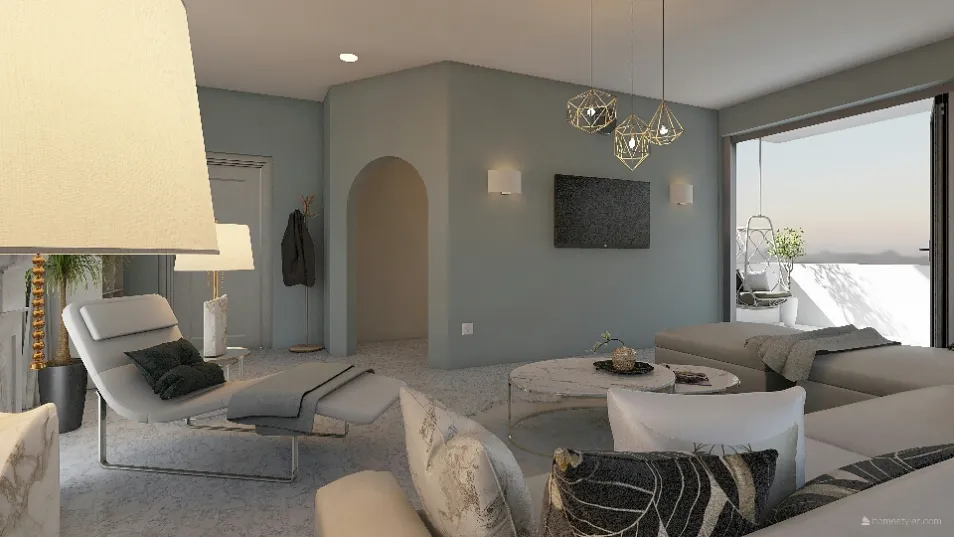 A screenshot from my Homestyler (web) design. An interesting view showcasing the balcony and adjacent area. I especially love the openness from the glass doors and wall opening.
