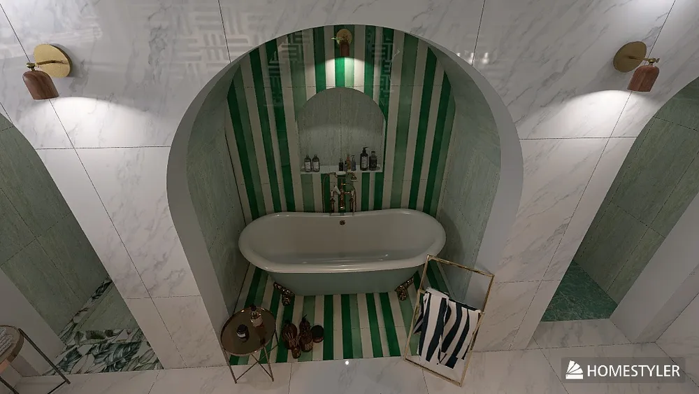 A bathroom with green and white details. A fusion of elegance and nature. The walls, covered in travertine marble and porcelain, bring a sense of sophistication and luxury, while the green, striped, and floral details add a touch of freshness and vitality. The bathtub invites relaxation, and the friendly plants create a cozy space, where every detail invites serenity.