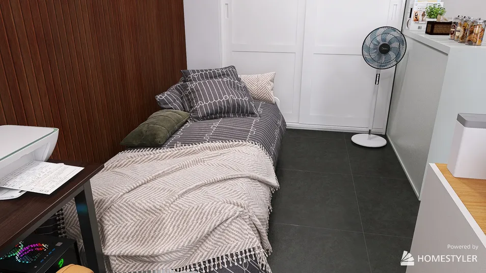 This studio blends simplicity with warmth. A cozy bed adorned with soft throws invites relaxation, while the sleek fan whispers of cool breezes. Every detail, from the textured linen to the minimalist decor, creates a serene retreat, perfect for unwinding after a long day.