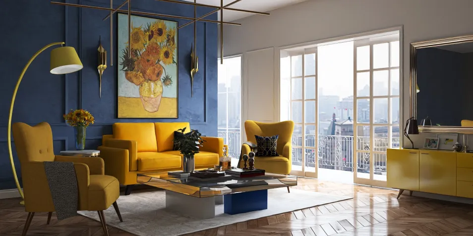 Яркие желтые диваны и кресла, контрастирующие с глубокими синими стенами, создают уют и энергетику. Стильные детали, такие как золотые лампы и современный стол, придают пространству уникальность, приглашая погрузиться в атмосферу комфорта и стиля.