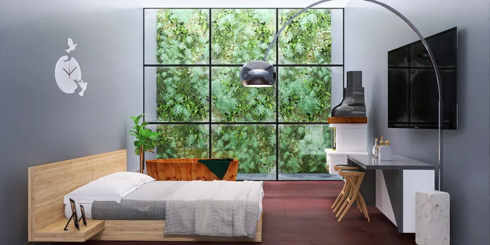um ambiente simples, contendo apenas uma cama, uma banheira e uma lareira, uma televisão e uma mesa de refeição, em poucos metros quadrados.
