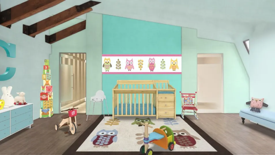 This little girls nursery has everything a little girl could want. Toys, stuffed animals, and cuteness.