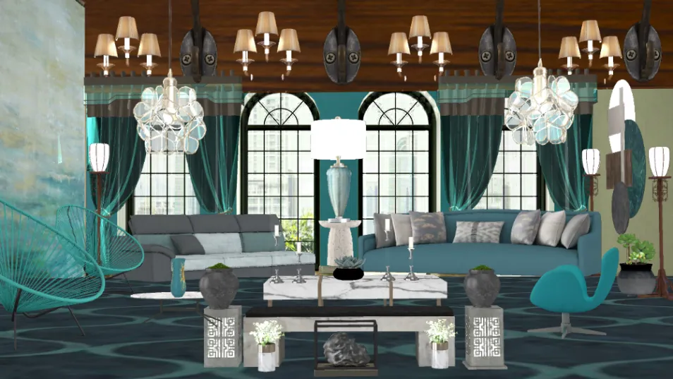Teal color with stone accents this living space.
