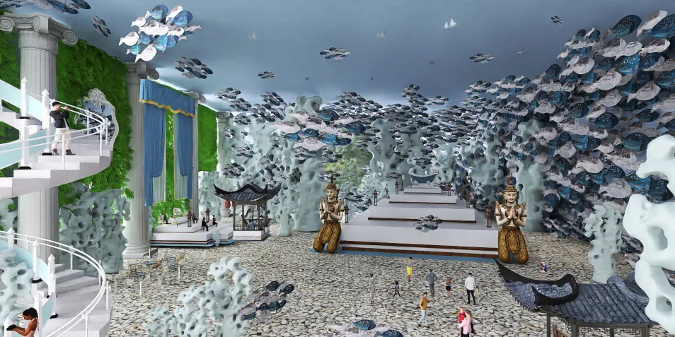Oneiric design People visit this enchanted place while harp is playing in the background