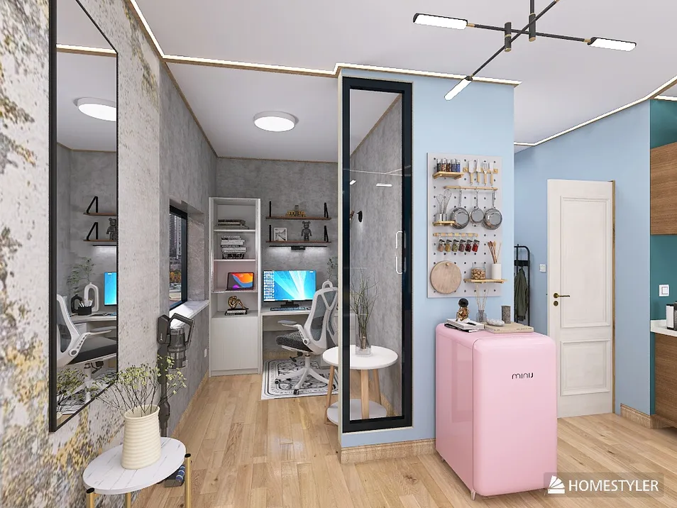Step into a contemporary 31 m² studio where every inch is optimized for comfort and flair. Warm oak-tone flooring runs throughout, grounding an open-plan living, dining and kitchenette zone. A rich teal accent wall anchors a sleek charcoal sofa and wall-mounted TV, while opposite, walnut-veneer cabinets and open shelving frame a compact kitchen. A pastel-pink retro fridge injects a playful pop of color, balanced by the soft curves of a round white-marble dining table and molded-plastic chairs. Above, linear black pendants and recessed LED strips outline the ceiling, casting gentle ambient light. The adjoining wall’s concrete-effect wallpaper adds a subtle industrial edge, softened by greenery on the loggia beyond floor-to-ceiling glazing. Textured textiles—a plush beanbag, patterned rug and Roman blinds—pull it all together for a cozy, modern, yet slightly eclectic feel.