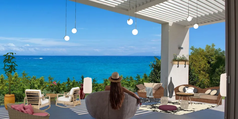 outdoor recreation - terrace in the South Western style with red shades. And no fence! you can just go outside this terrace. And you have a view of the Pacific ocean.