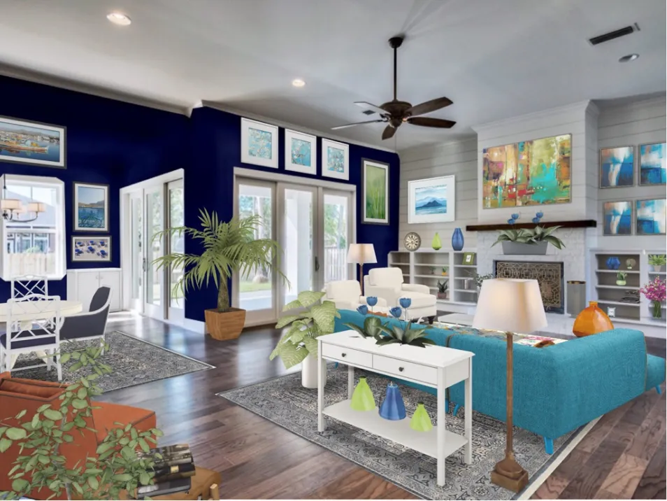 From navy blue to teal blues with a splash of green makes this a pleasant family room