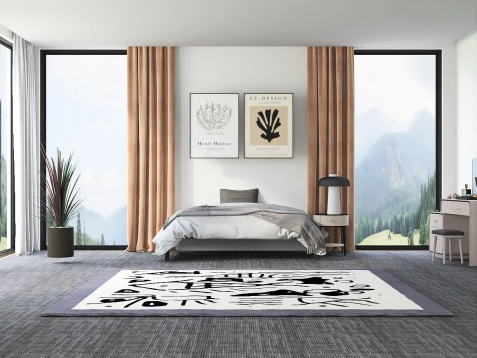 This is a very minimalistic bedroom, mainly black and white. The point of this simplistic design was to draw the eye out to the beautiful views from the two large windows on each side of the bed. I had a lot of fun using the new “Silence Grey” collection in this room, and it helped inspire the look. I hope you like this, and let me know in the comments what I should do next!