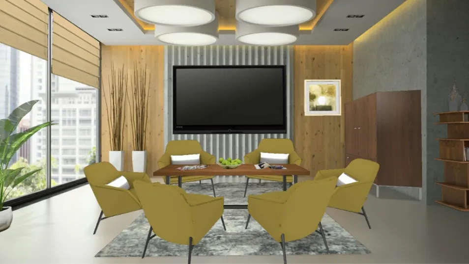 Modern Office Conference Room Just Five CCC Challenge turned full design. Mustard Yellow, Wood and Metal
