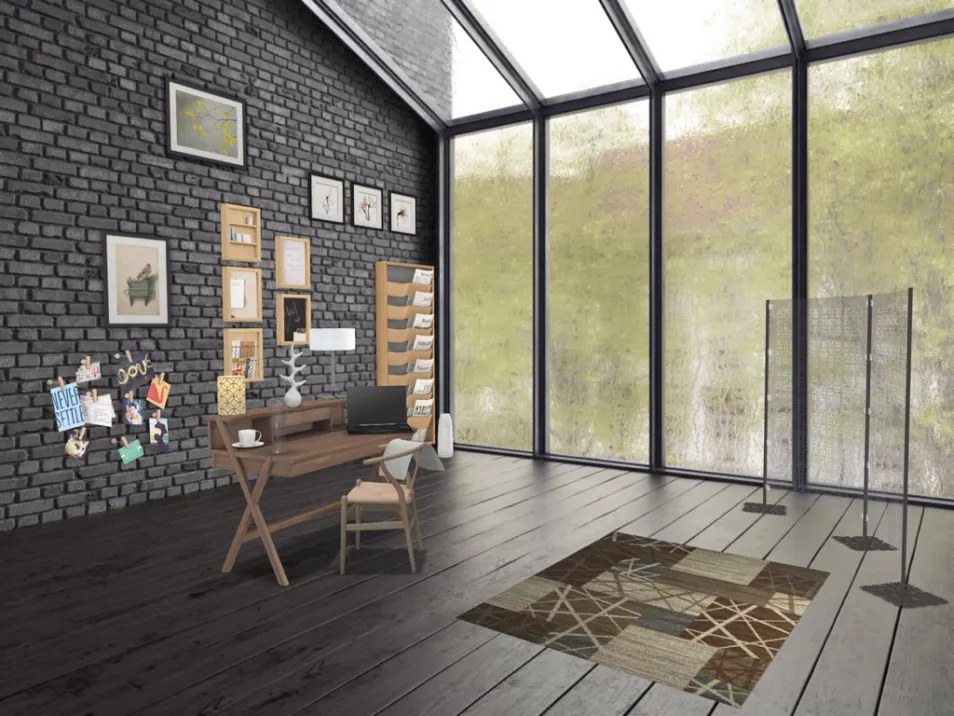 I seriously love this design.I chose this room because of the brick wall and glass which was half of the roof.The desk is slightly light and dark wood.I have also added some wall art and a light wood bookshelf.The curved glass thing makes the room more mordern.Please like and comment my design.Thankyou!!!