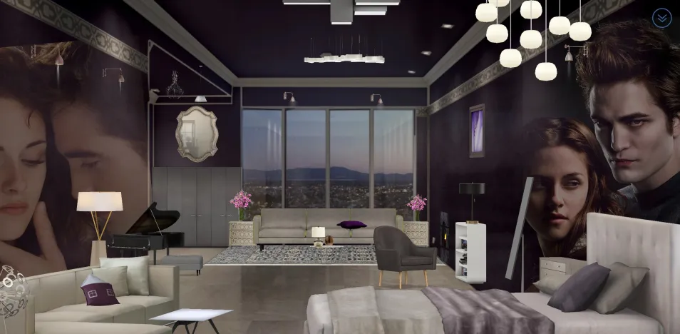 Actually bold colors are not my forte but dark tones always attract me... As a person I would love this kinda room for myself... but here i imagined bella & Edward' s room for a gostay with the city view... i used dark tone for wall & combined with silver n purple.