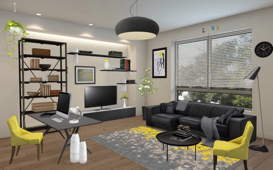 This is my idea of functionality. A minimal but good-looking livingroom where you can study/work/relax. Simple few colours: yellow, black and white and that's it!