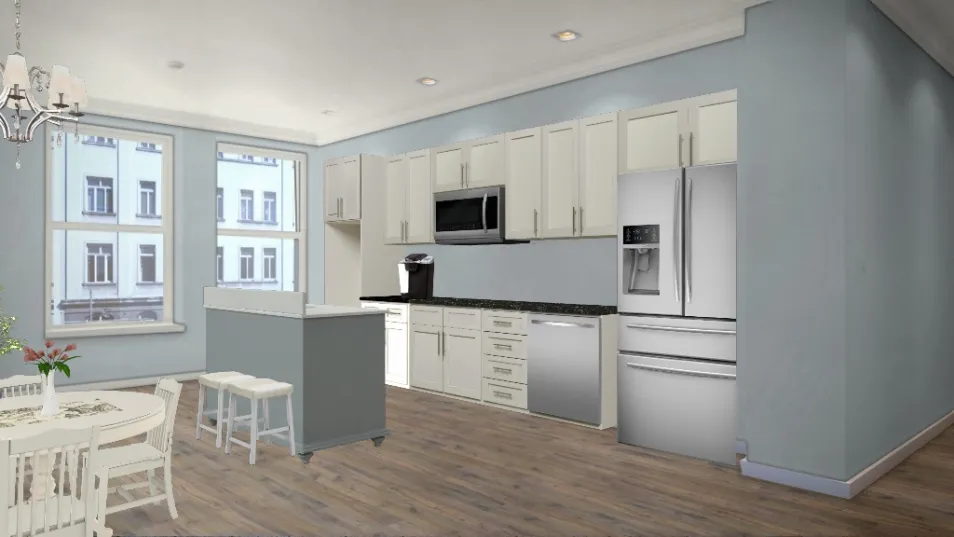 Traditional grey blue kitchen with simple white dining table and leading hallway.