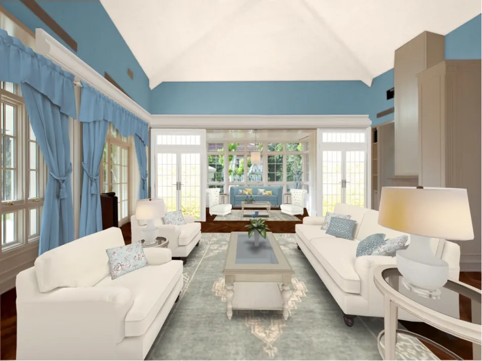 A traditional style sitting room with cream and blue tones to give it a tranquil serene feeling.