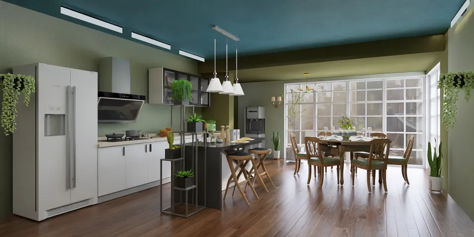 with lots of plant, green wall, sky blue ceiling and wood ornaments make this dining room like a garden party in modern way