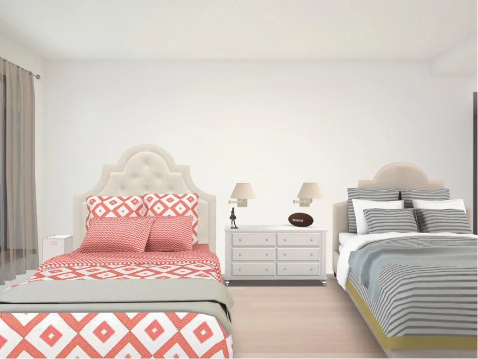 Two twin that are a boy and a girl and have to share a tiny room with no space and have to fit in two beds. The two colors clash but don’t look to bad