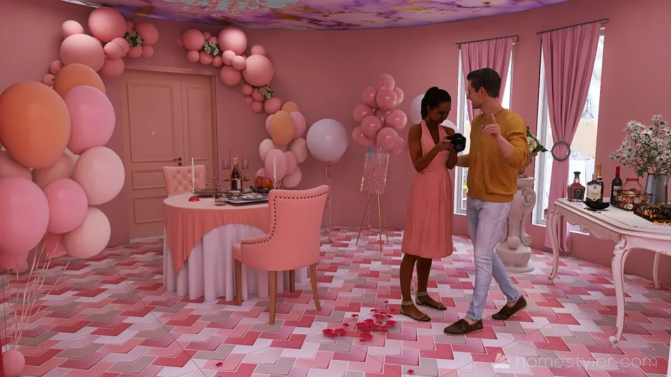 A two-story heart-shaped house with a pool and pond, perfect for a valentine's day celebration.