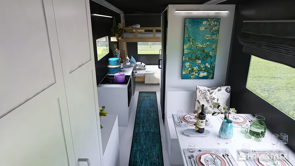 Un camper con área para comedor, mini cocina, baño, closets para almacenar ropa, una litera, en colores blancos y negros que le dan un toque simple y elegante.