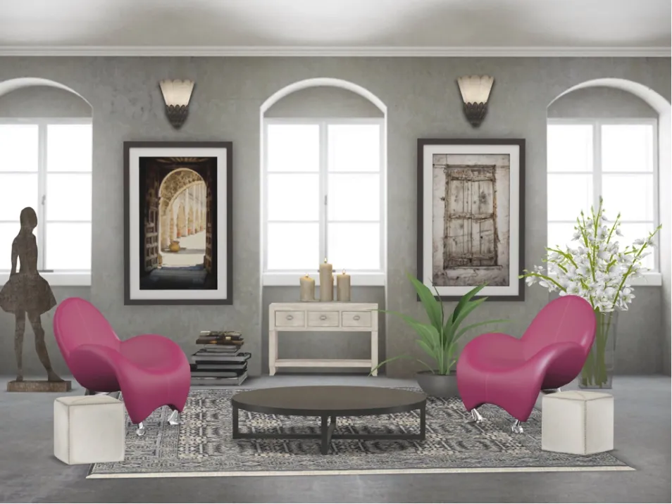 Love starting monochromatic, adding a pop of color and rounding it off with floor and wall art.