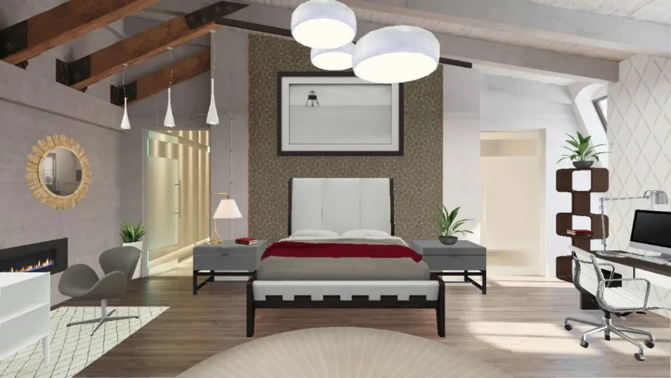 A bedroom with hints of colour here and there. With muted warm greys and warm whites, this space makes for a very comforatble and cozy apartment bedroom.