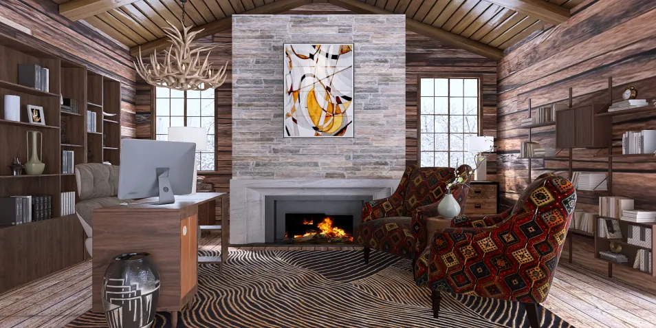 In the once dusty attic, a lovely office has warmth and envelops one like an old friend. The inviting glow of the fire flickers against the rustic stone, casting shadows that dance with forgotten memories. An eclectic mix of books and art whispers tales of solitude and inspiration, a perfect haven for the mind.