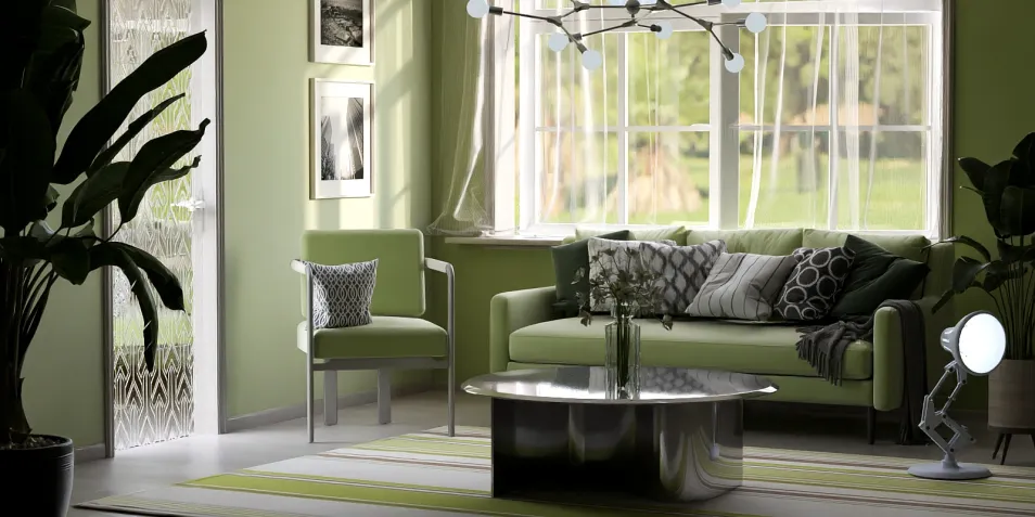 In einem Raum, wo die grünen Wände flüstern und das Licht zärtlich spielt, ruht ein silberner Tisch, wie ein stilles Versprechen. Die Pflanzen, Zeugen der Zeit, scheinen zu sagen: ‚Wohlstand ist vergänglich, doch der Stil bleibt stets unberührt.‘