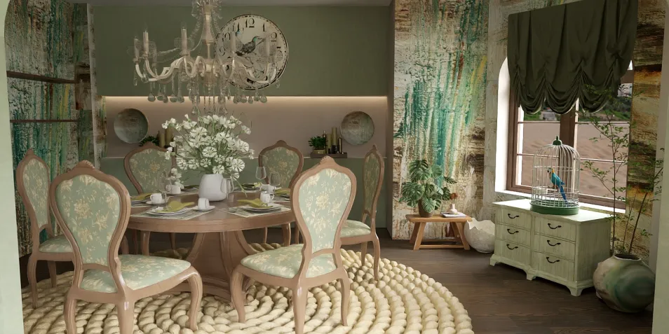 Step into a dining oasis where vintage charm meets natural elegance. This room, bathed in soothing greens and warm beige, invites tranquility. The centerpiece—a round wooden table adorned with floral-upholstered chairs—sets the tone for heartfelt gatherings. A dazzling chandelier casts its glow, while delicate details like the bird-themed clock and birdcage create a harmonious connection with nature. The walls, textured with artistry, and the curated decor, featuring fresh blooms and curated vases, make every meal an event worth savoring. Draped curtains frame sunlit windows, completing a scene of serene sophistication.