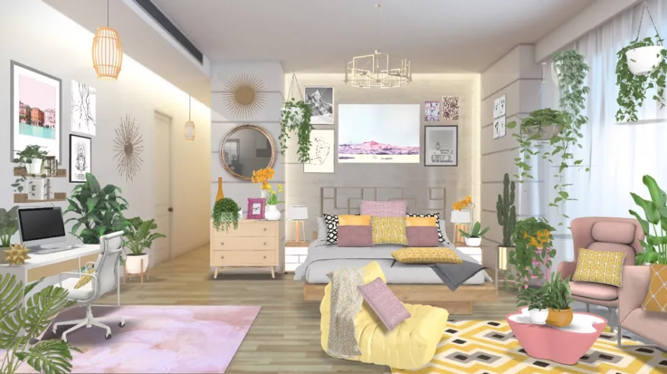Full of colour, plants & art deco geometric pieces. This customised multifunctional room will be sure to brighten up anyone’s day! Yellow is an under appreciated colour, but i’ve made it pop in so many ways! Enjoy this room & feel the sunshine through this space 💛🌿✨