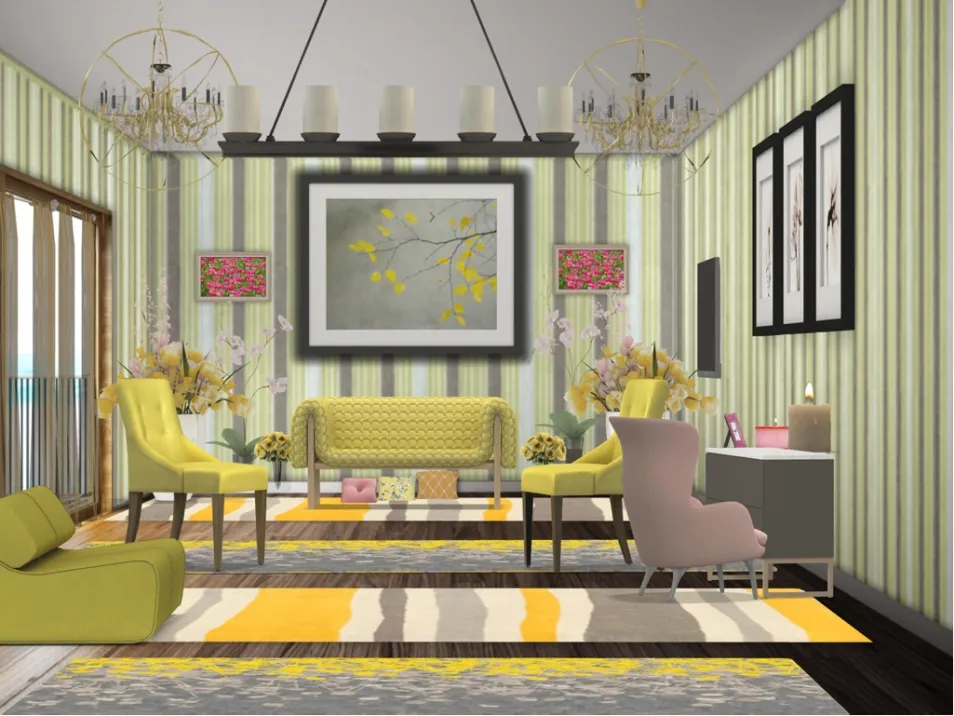 Yellow and gray living room with touches of pink. Hope I get likes on this!💖💝💕