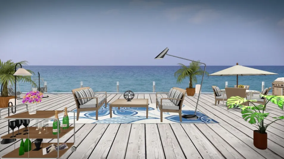 nesse projeto procurei fazer uma área de lazer despojada e confortável, usei móveis leves e criei diferentes funções para o mesmo lugar, área de refeição, área de estar, estação de bebidas e taças, e cadeiras de balanço tipo rede de frente para o mar.