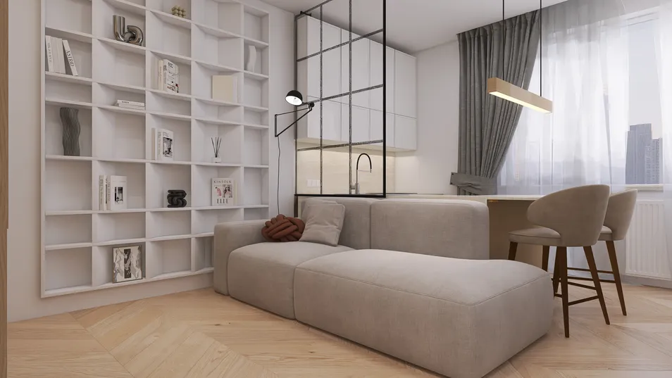The kitchen-living area embodies minimalism, where every detail harmonizes. Light floods through sheer curtains, illuminating the seamless blend of textures. The space invites simplicity, encouraging a flow that feels both spacious and intimate, perfect for modern living.