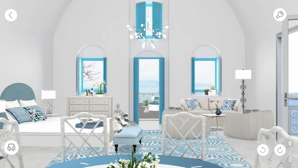 Winter at a Santorini villa designed in pristine white, cool blue and grey accents along with grey limestone on the adjoining terrace.