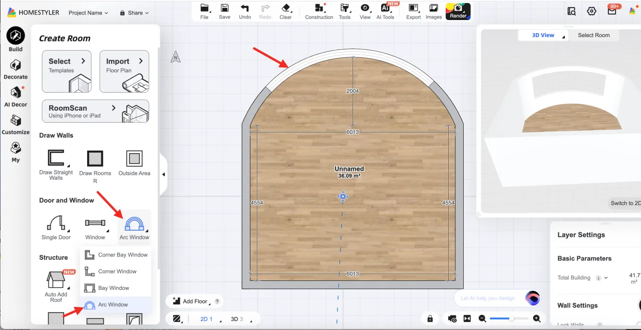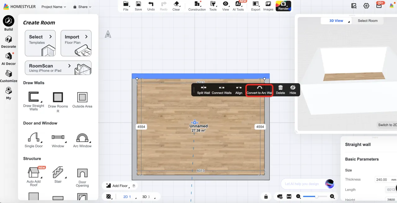 Select the wall in 2D plane view, and click "Convert to Arc Wall" to convert a straight wall to an arc wall. Drag the curved wall or type in the arc radius value could edit the curvature of the arc wall.